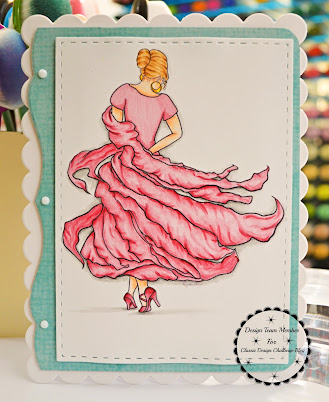 I chose to color the dancer in pink instead of a red, to give the dancer a real feminine, soft look. My main Copic colors on the dancer were R81, R83, R85, and R89. I cut the main image out with Pinkfresh's Stitched Rectangles, then matted that over some blue 49 & Market paper, just to pop that pink a tad more. I cut a fancy border on the blue design paper with a long since retired MFT die, then matted that on top of popdots over a scalloped backing, cut from Spellbinders Heartfelt Thanks and Scallops die. I did place some white gems from Honey Bee Stamps along the decorative edge for some interest, but otherwise, wanted just the dancer to be the focus of my card.